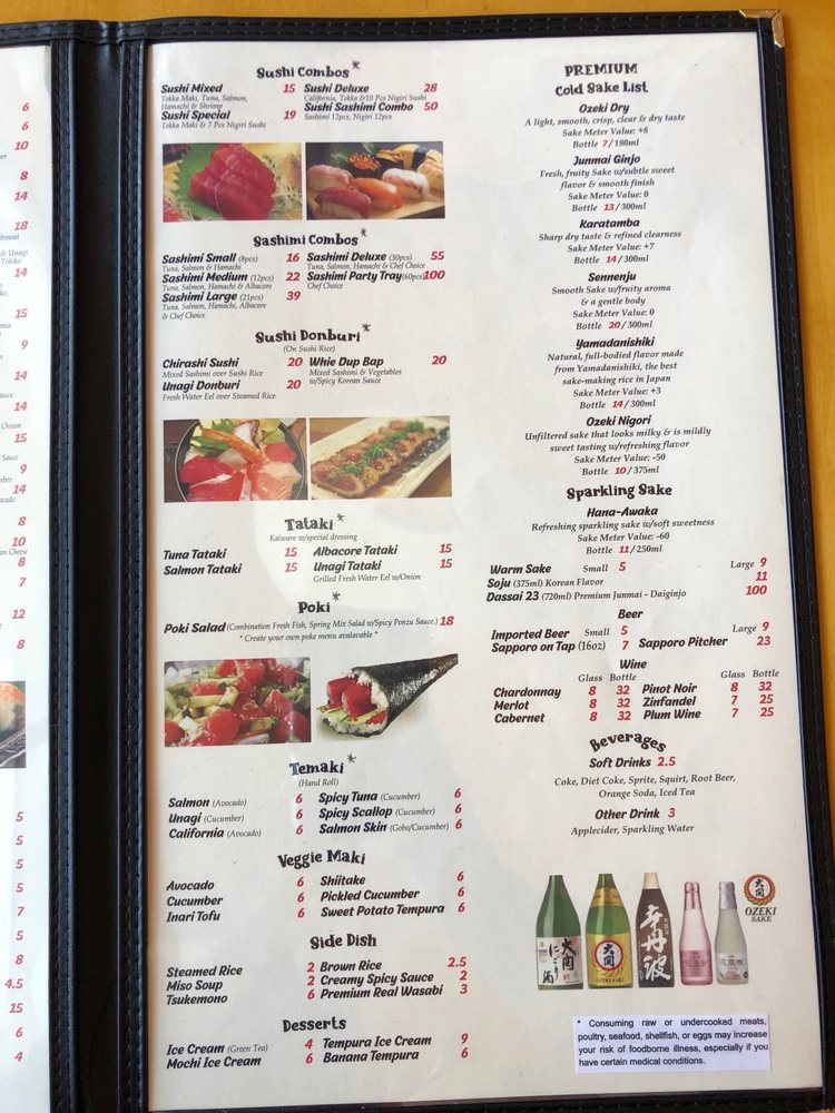 18 pieces of California roll, 12 pieces of tuna maki, 12 pieces of cucumber maki, eight pieces of futo maki and six pieces each of unakyu, tuna, salmon, shrimp and unagi sushi.
